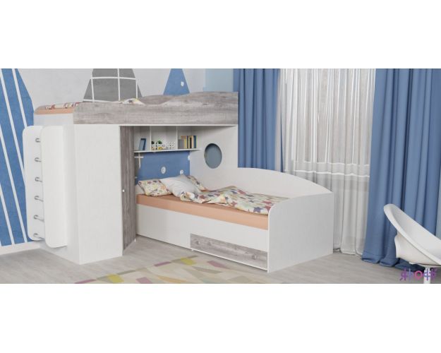 Кровать-чердак Кадет-2 угловая с металлической лестницей Белое дерево/Бетон