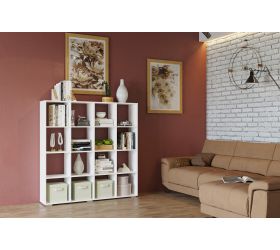 Стеллаж выполнен в форме квадрата, разделенного на 16 ячеек. Отлично подойдет для современной гостиной.
