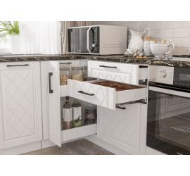 Размер кухонного гарнитура: Ширина левой стороны 3000 мм. Ширина правой стороны 1700 мм. Высота 2336 мм. Глубина 600 мм. (с учетом столешницы)