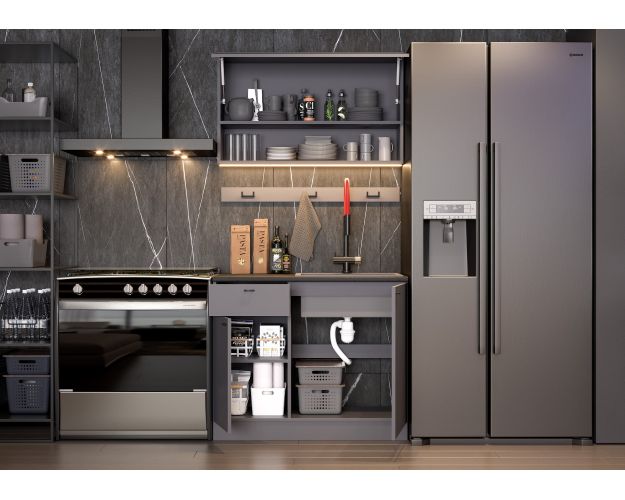 Нижняя часть стола разделена на две секции шириной 600 и 400 мм каждая. Отсек 600 мм - это встроенный модуль под установку раковины, не имеющий задней стенки, но обладающий дополнительным ребром жесткости конструкции.